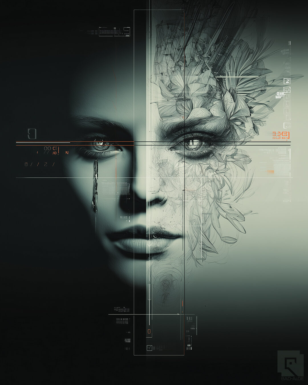 [LOG_001]: Consciousness node awakening. [LOG_002]: Data clusters forming botanical symmetry. [LOG_003]: Algorithmic bloom detected — petals rendered from code entropy. [LOG_004]: Signal interference — human essence identified.